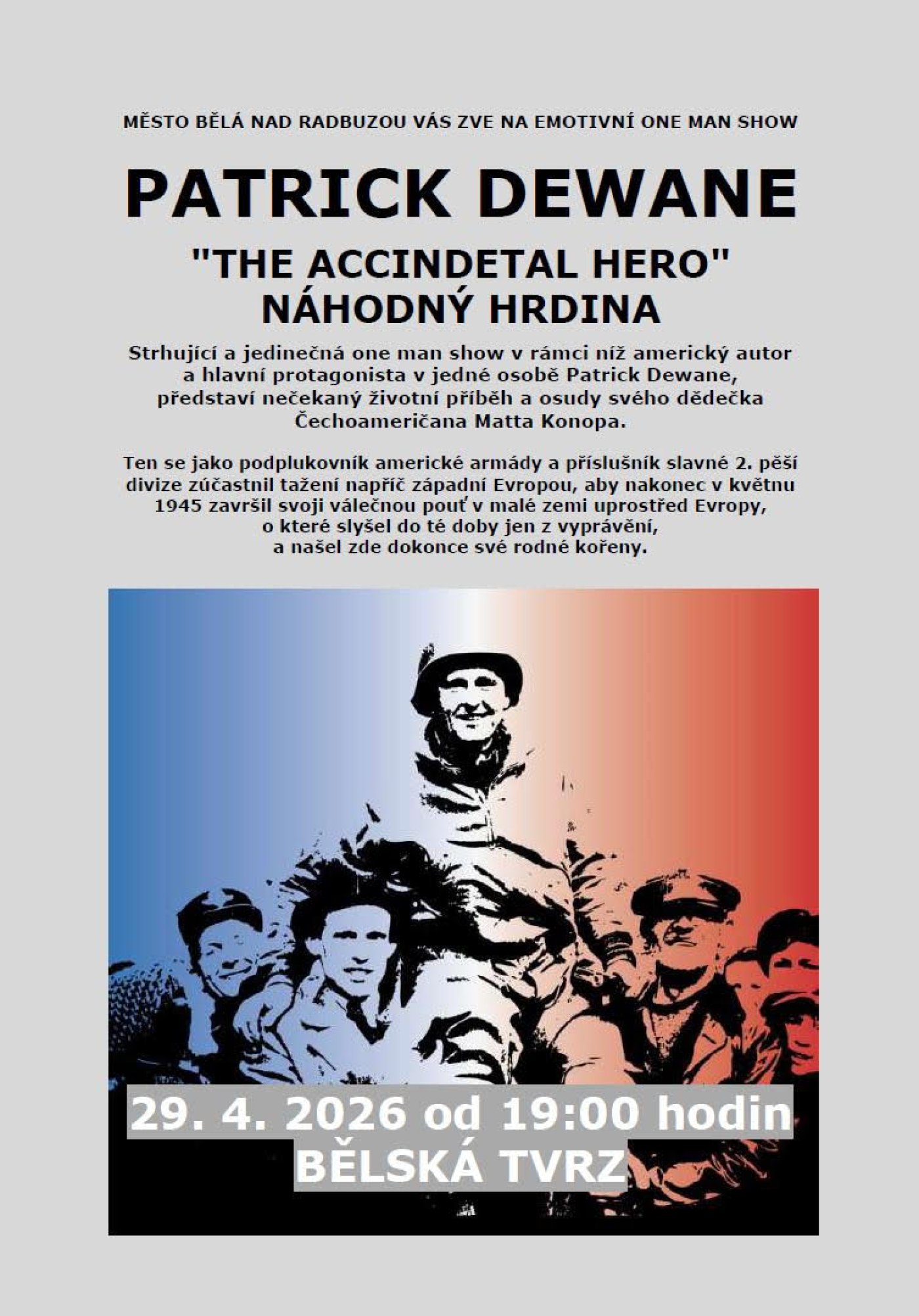 Strhující a jedinečná one man show v rámci níž americký autor a hlavní protagonista v jedné osobě Patrick Dewane představí nečekaný životní příběh a osudy svého dědečka Čechoameričana Matta Konopa. Ten se jako podplukovník americké armány a příslušník slavné 2. pěší divize zúčastnil tažení napříč západní Evropou, aby nakonec v květnu 1945 završil svoji válečnou pouť v malé zemi uprostřed Evropy, o které slyšel do té doby jen z vyprávění, a našel zde dokonce své rodné kořeny.